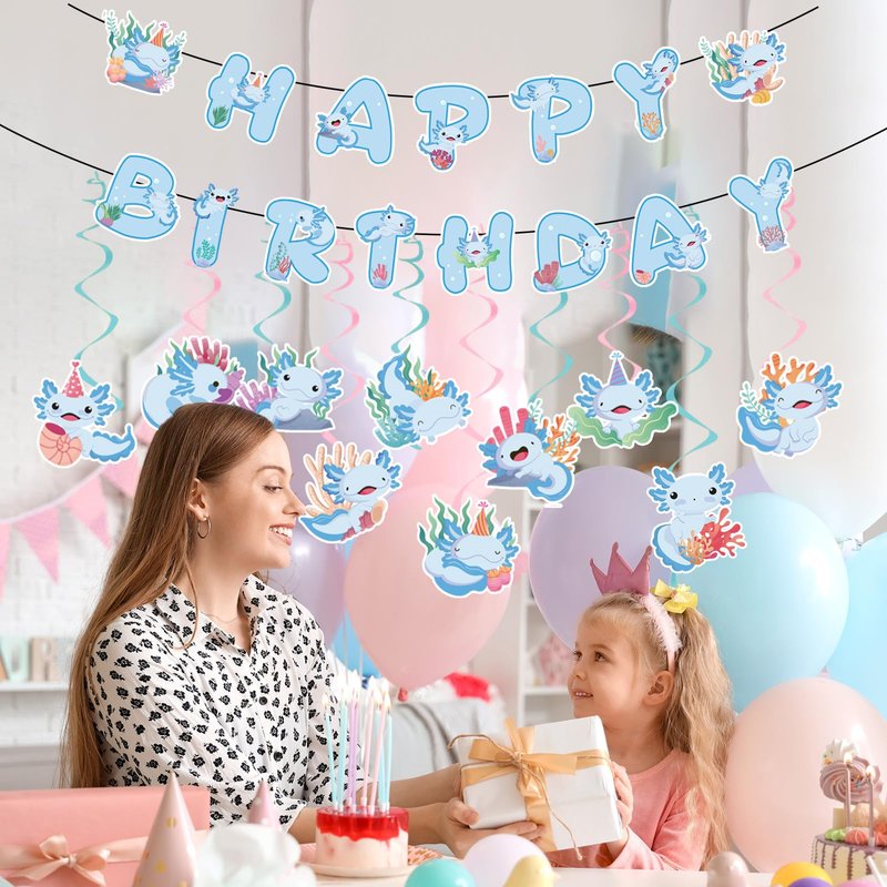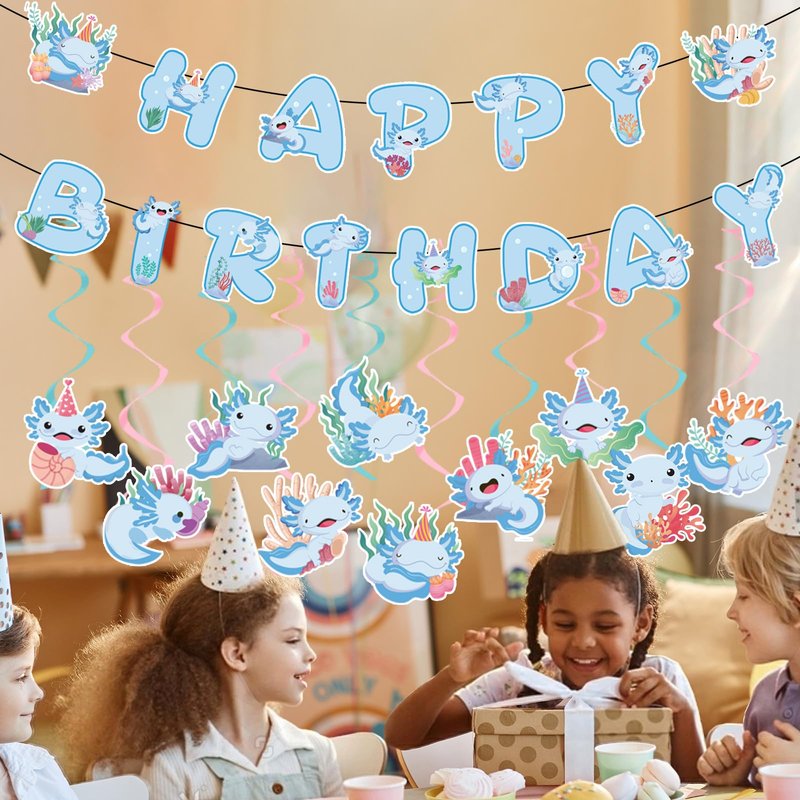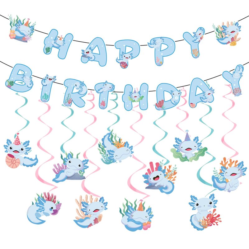 - What You Will Receive:The birthday party decorations are themed with cute axolotls, including 2 birthday banners and 10 hanging swirls Each decoration incorporates the cartoon image of the axolotl, adding a touch of fun and vitality to the birthday party