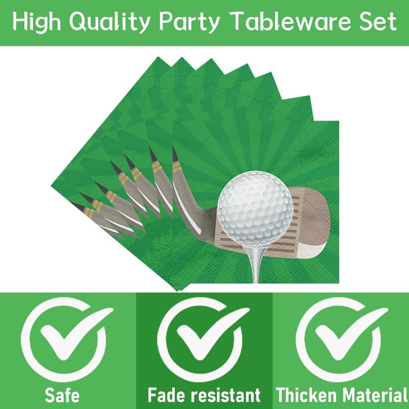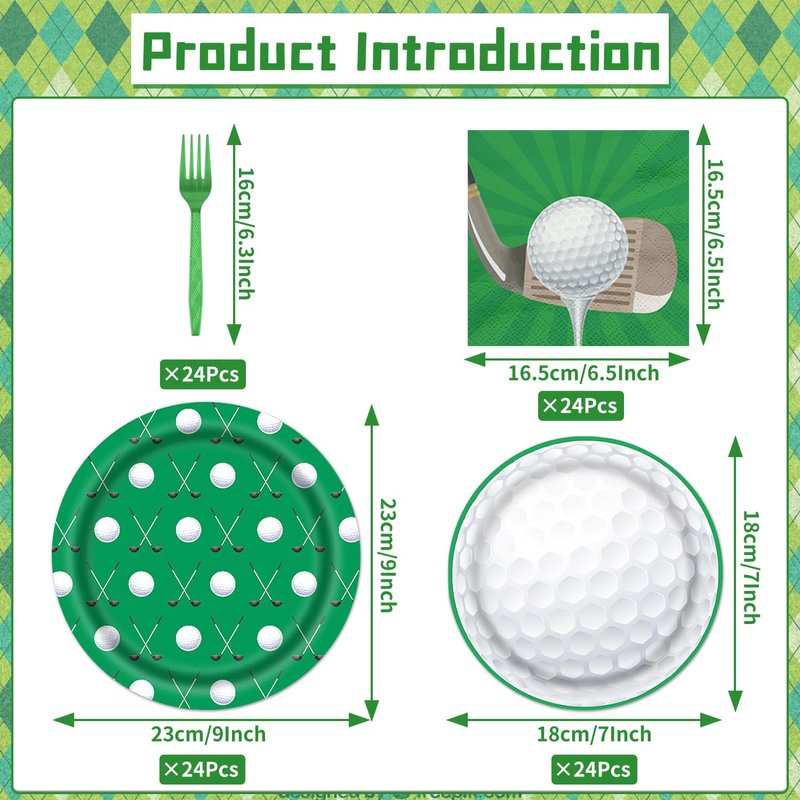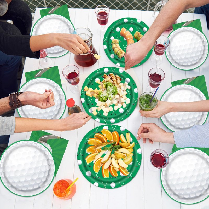 - Golf Party Dinnerware: Golf-themed dinnerware set of 64 pieces, including 16 large dinner plates, 16 dessert plates, 16 forks, and 16 paper towels. Make your golf party full of atmosphere and more fun.