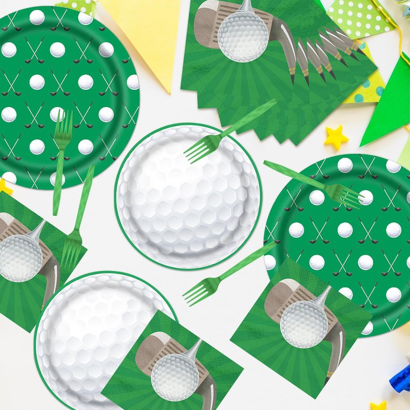 Golf Party Dinnerware: Golf-themed dinnerware set of 96 pieces, including 24 large dinner plates, 24 dessert plates, 24 forks, and 24 paper towels. Make your golf party full of atmosphere and more fun.