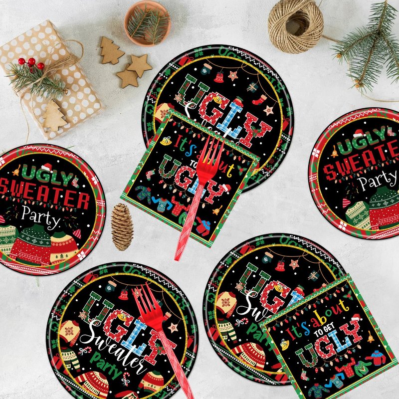 - Ugly Sweater Plates: You will receive the ugly sweater themed Christmas party plate set, including 24 large dinner plates, 24 small dinner plates, 24 it's about to get ugly napkins and 24 forks, totaling 96 pieces. Ugly sweater Christmas party plate set serves 24 people and will give your party space a fun, festive look and create a unique atmosphere.
