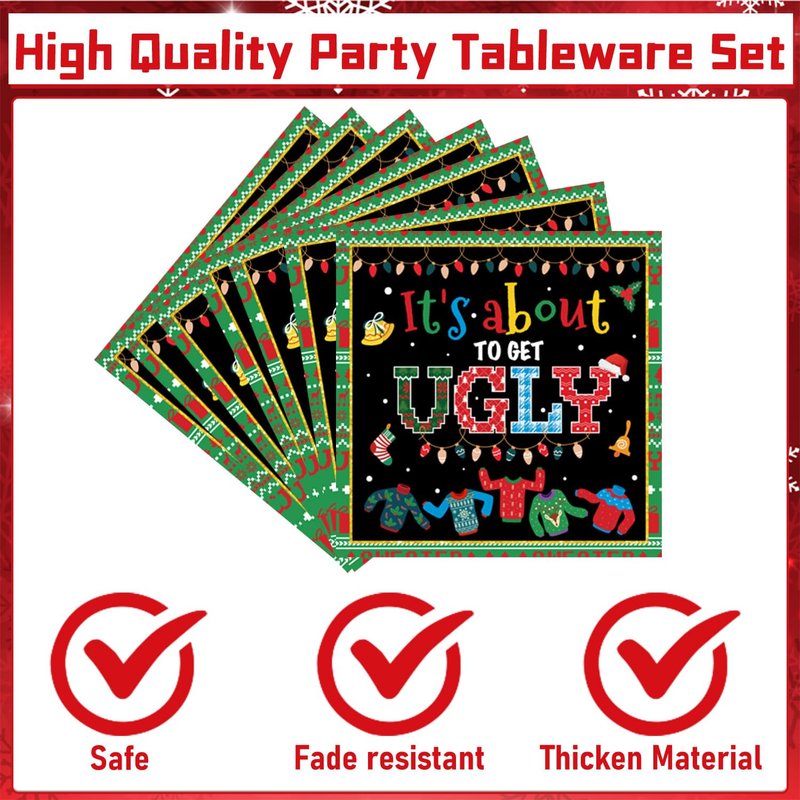 - High Quality: The ugly sweater Christmas party dinner plate set is made of high quality paper material, which is not easy to ooze grease when serving cakes, desserts and other kinds of food, thus keeping the table clean and tidy. The paper napkins in the ugly sweater fun Christmas party disposable dinnerware set are also soft and perfect for use.