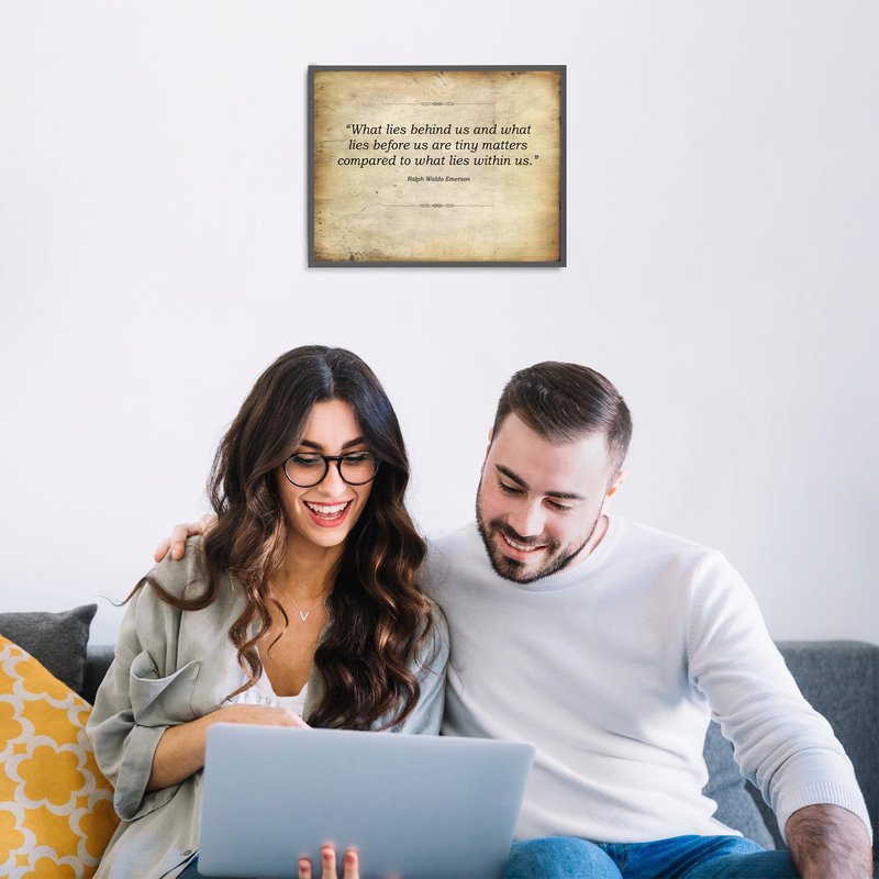 - Ralph Waldo Emerson Quotes - What Lies Behind-Before-Within Us - 10 x 8 Poetic wall art poster This scripture wall art poster print features a profound quote by Ralph Waldo Emerson, What Lies Behind-Before-Within Us, beautifully displayed on a distressed parchment print. The vintage-inspired design adds a touch of retro charm, making this quote wall poster print a perfect addition to your home, office, study, or school decor.