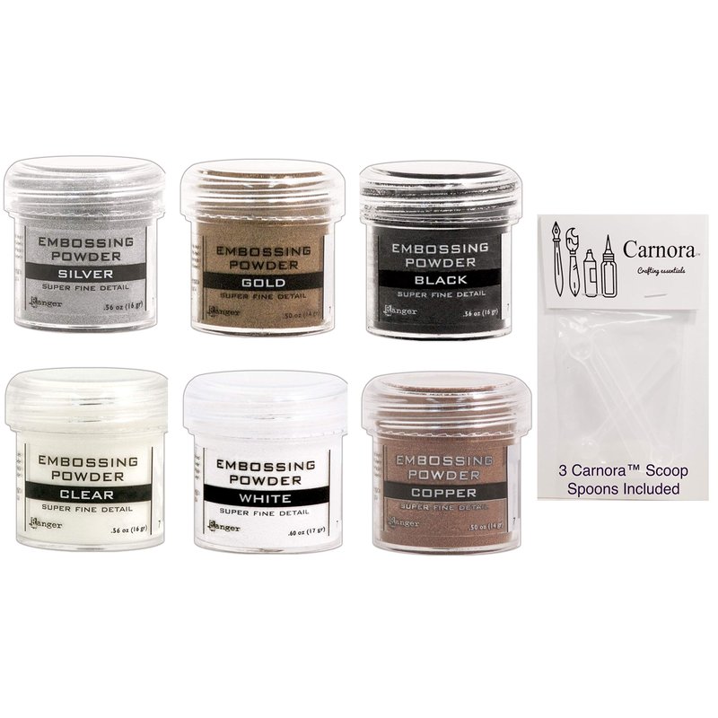 Ranger Fine Super Embossing Powder, White, Silver, Black, Copper, Clear and Gold, Bundle of 6 1/2 Ounce Jars Plus 3 Carnoras Scoop Spoons