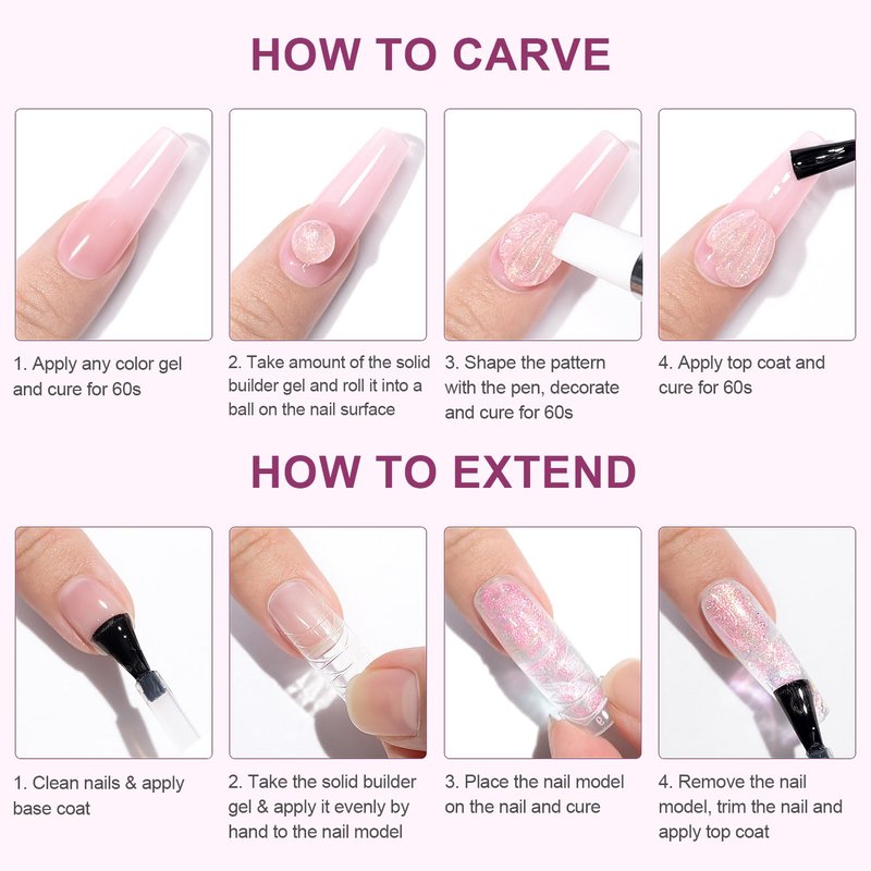 - VERSATILE EXTENSION GEL: More than just extension gel! DIY designs, 3D carve patterns, and nail extensions, it's easy to achieve as long as you have a solid nail extension gel. It is a non-floating formula and its non-sticky texture makes manicures more convenient and interesting.