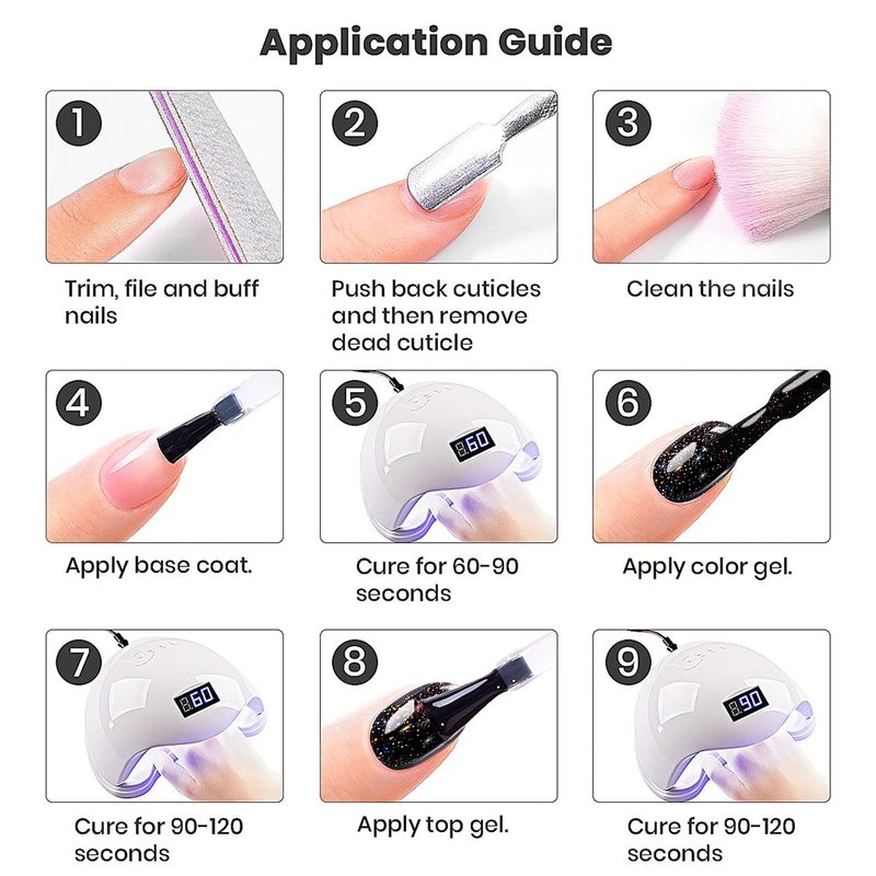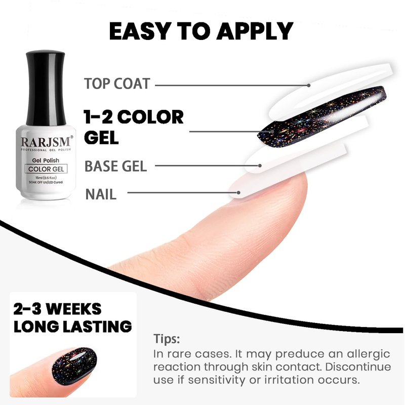 - EASY APPLICATION LONG LASTING:This black glitter gel polish is long lasting for 21+ days with perfect shine under proper application. Highly recommend a minimum of 60 seconds with a LED light and 2 minutes with a UV lamp for each layer