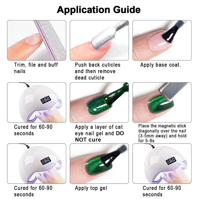 - 【HOME SALON QUALITY】Glitter cat eye gel nail polish is good choice for use in a professional nail salon or nail starter at home.You can design your own manicure at home to show your style. Remember the gel polish needs to be cured under LED or UV nail lamp. Average for Nail Lamp 60-120 secs.