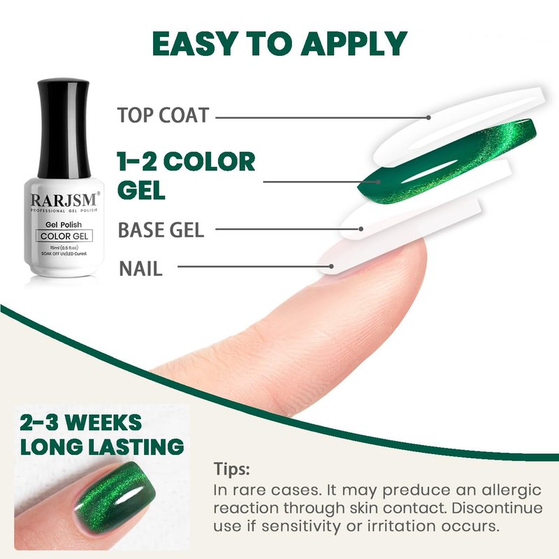 - 【GREEN VELVET CAT EYE EFFECT】Cat eye gel nail polish is a truly dreamy effect that reflects light in the same way a crushed velvet texture might. Made with fine magnetic shimmers and green pigments, our new shades create optical nail-lusions that move with every angle.
