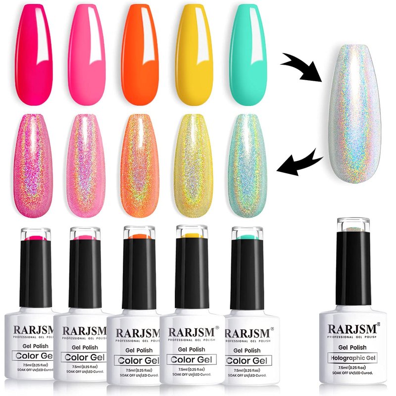 RARJSM Neon Gel Nail Polish Kit Soak off Holographic Nail Polish Set Silver Glitter Nail Polish Irridescent Colors Green Yellow Neon Orange Hot Pink Rose Red 6 Piece Set 7.5ML Curing Required