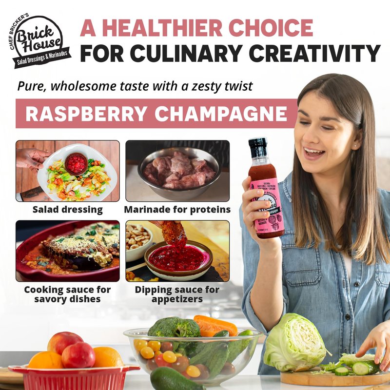 Pop the cork and grab a fork! We know most salad dressings are full of junk - our promise is to stay clean. Other brands offer watered-down products with unhealthy hidden additives like xanthan gum, MSG, starches, or food colorings. Not us. We’d only offer to put something on your table that we’d put on ours - the BEST tasting healthy food. We use premium, fresh, natural ingredients without adding any artificial preservatives, sweeteners, or stabilizers. You've finally found the delicious and low sodium salad dressing you've been looking for! Raspberry Champagne - No, its not alcoholic... but you may definitely want to bring it to your next party! Our Raspberry Champagne is sure to bring the pizazz to your salads and other dishes. We take a champagne vinegar and soak a gourmet raspberry puree in it, then add in the cold pressed, non-gmo sunflower oil and naturally sweeten it with honey - no artificial sweeteners or preservatives! We only use fresh and whole ingredients you can pronounce, such as kosher salt, white pepper, sunflower lecithin, tarragon, & mustard powder. The result? A delicious, tart and light salad dressing! Whether its a hot day at the grill or slow baked dinner at home, our raspberry vinaigrette dressing is the perfect fit for those looking enhance their summer salad, broccoli salad, or even marinated chicken breast, fish or prok!! Its a Non-Gmo, egg-free, gluten-free, dairy-free, soy-free, keto friendly, low sodium, and low carb salad dressing. You don't have to choose between food that tastes good and food that is healthy. Brick House is the "Vinaigrette with No Regret."
