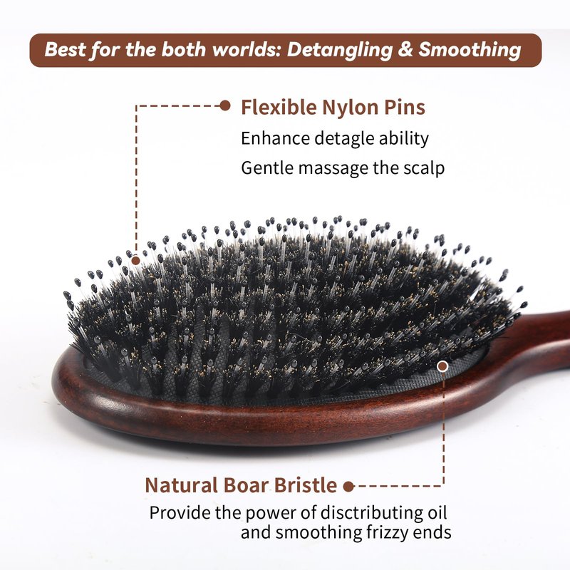 - NYLON PINS FOR DETANGLING: The hair brush stiffer nylon pins can easily remove and detangle hair knots even for long thick hair, smooth your messy hair. coordinate with boar bristles, you can grooming your hair with less damage, less washing, and less dandruff. softer, shinier, healthier.