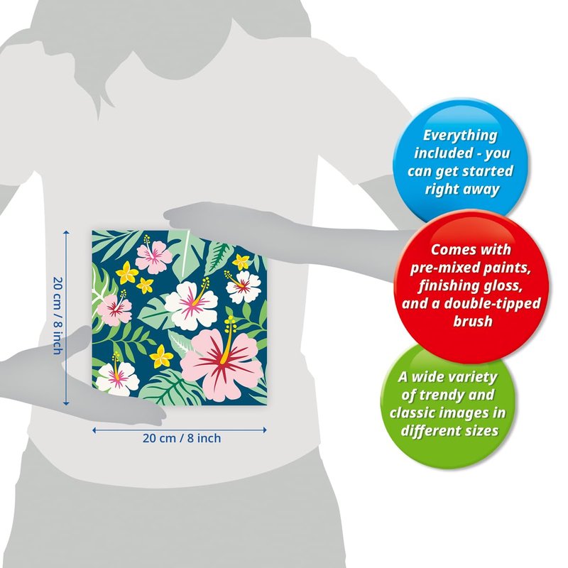 - Everything Included: Water-based acrylic paints in resealable pots, 1 packet of finishing gloss, 1 double-tipped brush, 2 paint holder palettes,1 cardboard canvas, 1 painting reference guide, 1 set of simple instructions, and 1 picture hanger.