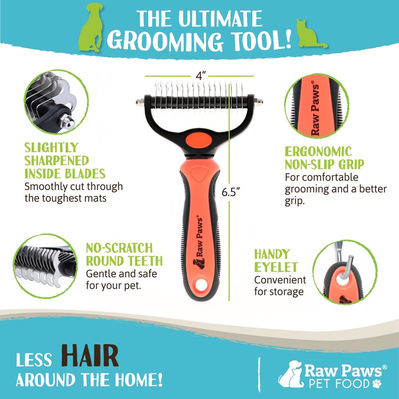 Raw Paws has the cat and dog undercoat rake you need to remove loose fur and detangle your pet's hair! The double-sided design of this pet grooming tool helps to carefully de-shed AND de-mat your pet in less time. Our dog and cat detangler comb has rounded blades that are sharp enough to cut through matted fur, but delicate enough to safely use without scratching or causing irritation. Try out this under coat brush for pets and see the difference!