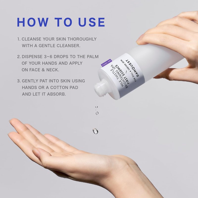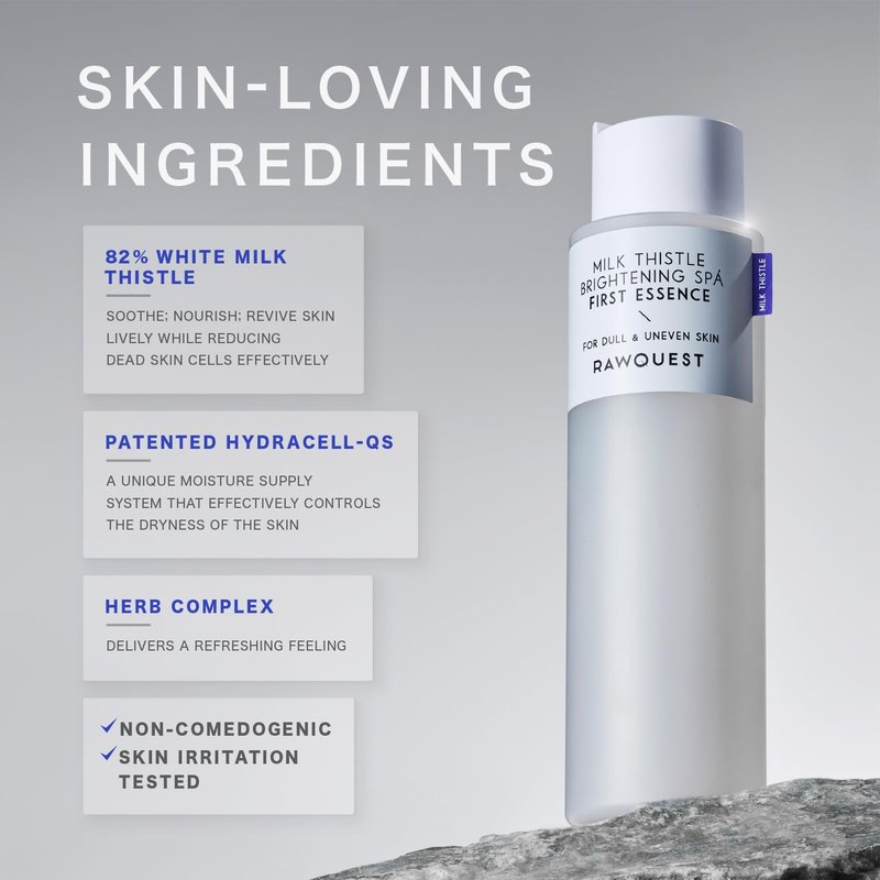 - ๐งด Dermatologist Tested: Trust in the expertise of dermatologists who have put our product to the test. RAWQUEST 82% Milk Thistle Brightening SPA First Essence has been dermatologist-tested to ensure safety and efficacy for all skin types.