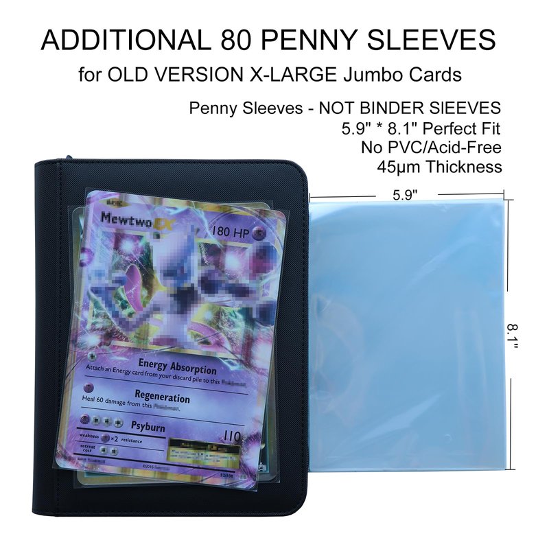 - Premium Build: Holds 80 Jumbo cards size XL with 40 double-sided pocket pages bound to the spine, built without rings. No more worrying about rings damaging your collectibles. Binder includes 80 Size XL Penny Sleeves.