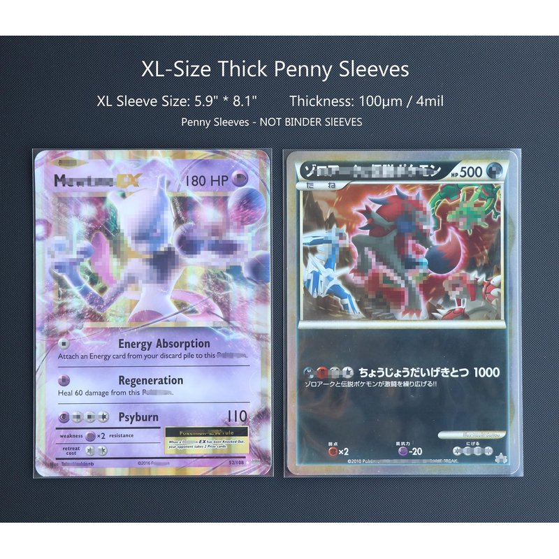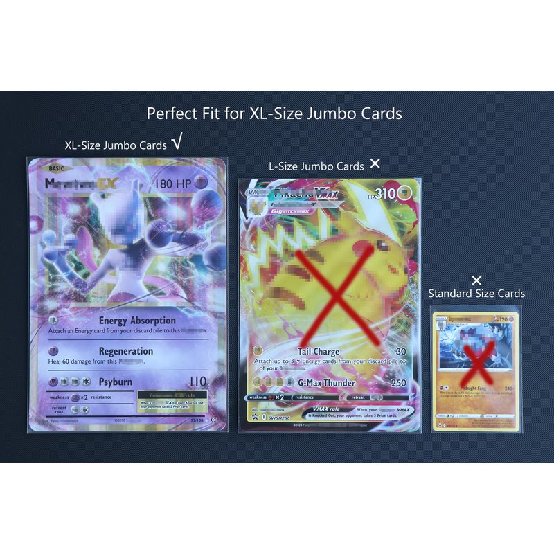 - Perfect Size: Sized to fit Jumbo cards XL : 5.7"x7.9" perfectly (Compatible with PTCG XL, NOT compatible with MTG sized jumbo cards) Package Includes: 50 Jumbo Card Sleeves XL.