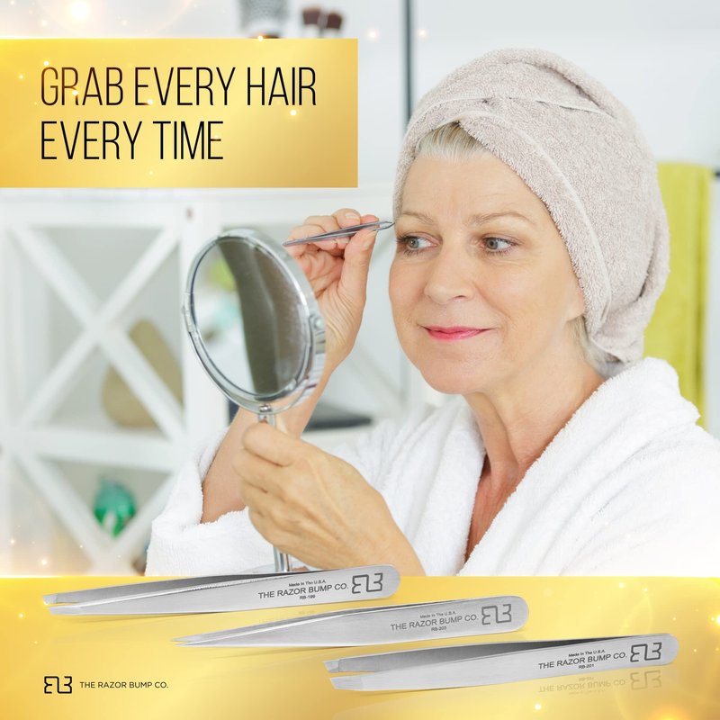 Experience the Artisan Micro Slant Fine-tune your eye brow shaping skills with hair removal tweezers by The Razor Bump Company. Handcrafted in the USA by the Picasso of the tweezer industry, these brow tweezers offer all the benefits of full-size tweezers in a travel-friendly eyebrow kit. Micro-slant tweezers with 25-degree angled tips with flat tips tackle ingrown hairs and perform precision work. High-quality stainless steel has been meticulously aligned to grab every hair, every time. Keep Strays Away Having handcrafted tweezers since the 1920s, our artisans create the best tweezers for chin hair removal and eyebrow grooming. All in One tweezer for facial hair removal and personal care, you can target fine hairs on crowded areas of the upper lip and brows or remove stubborn, coarse hairs without pain or scarring. Their stainless-steel construction is rust-resistant so they are impervious to the damp, humid conditions of bathrooms and they are less apt to cause skin irritations or breakouts. Look Great, Even On-the-Go With the Artisan Micro Slant in your vehicle, toiletries kit or travel accessories, you will be impeccably groomed for big meetings and blind dates. You are also ready with first aid tweezers to take-on unexpected splinters or fiberglass fibers. Have an eyebrow plucker on-hand in hotel rooms, lash tweezers at your fingertips for applying false eyelashes, or an ingrown hair tool handy for beards and bikini lines. With so many uses for Artisan Micro Slant, they are thoughtful birthday gifts or stocking stuffers for women and men. Elevate personal grooming to an artform. Add our tweezers set to your beauty products today.