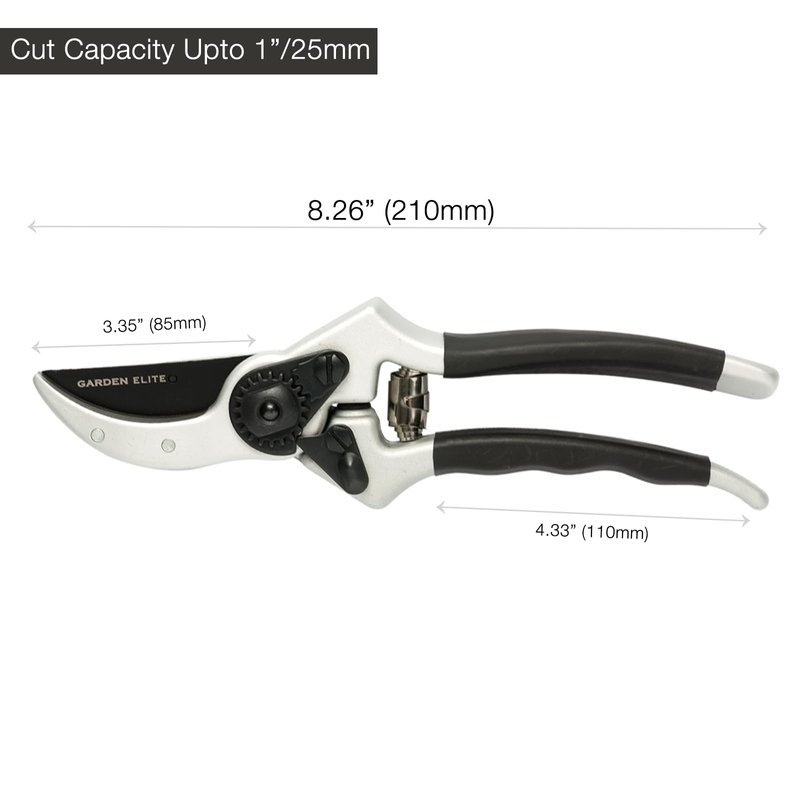 - Ergonomic Rubber Grip - This pair of premium garden cutting shears feature a forged aluminum handle that has been ergonomically designed to fit comfortably in your hand. The handle is coated with non-slip rubber grips for added comfort and an easy-to-operate thumb lock.