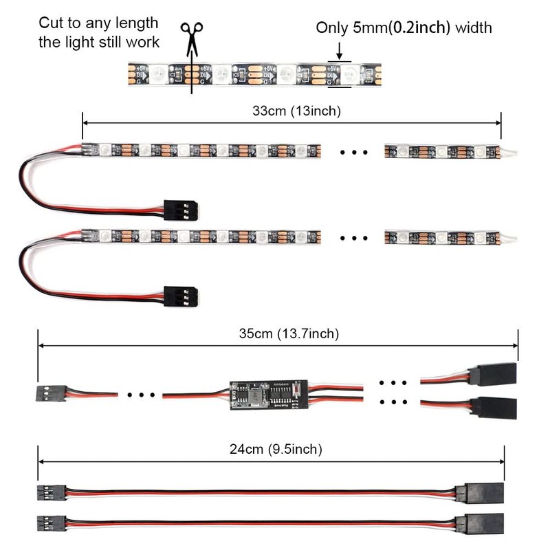 This Light strips and controller kit is suitable for RC car, truck, RC airplane, RC boat drone, fixed-wing and other RC vehicles. You can remote control the light via your transmitter or the button on the Light controller. The lights can still work independently without a receiver, just power it. The light color and lighting mode are changeable. Total 21 working modes. The light strips are super bright. 2 PCS 0.33m (13inch) light strips is almost suitable for all scale RC car or airplane. The controller can remember the last setting when power on. It is compatible with nearly all brand RC car truck crawler like Traxxas, Tamiya, Axial, HSP, or Redcat, etc.