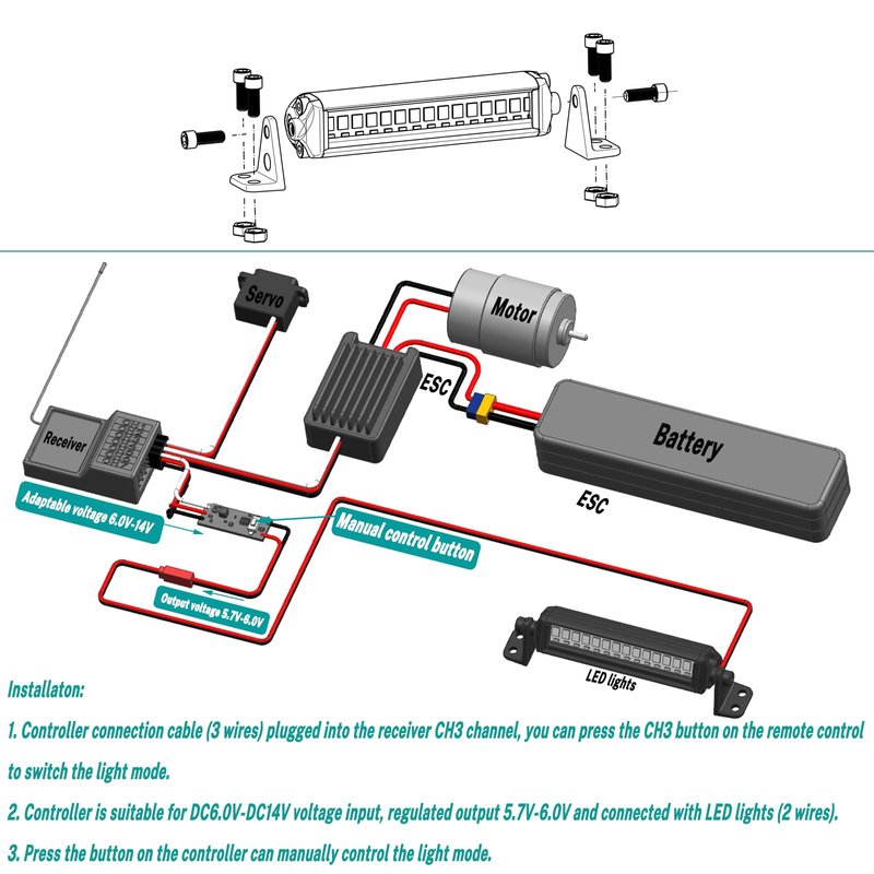 - 4.LED strips are suitable for DC6.0V input, when the input voltage is 6.0V, the brightness and heat generation of LEDs are optimal. When using voltage lower than DC6.0V, the light is dim, red line is positive and black line is negative, the receiver (CH3.CH4.CH5) provides power.