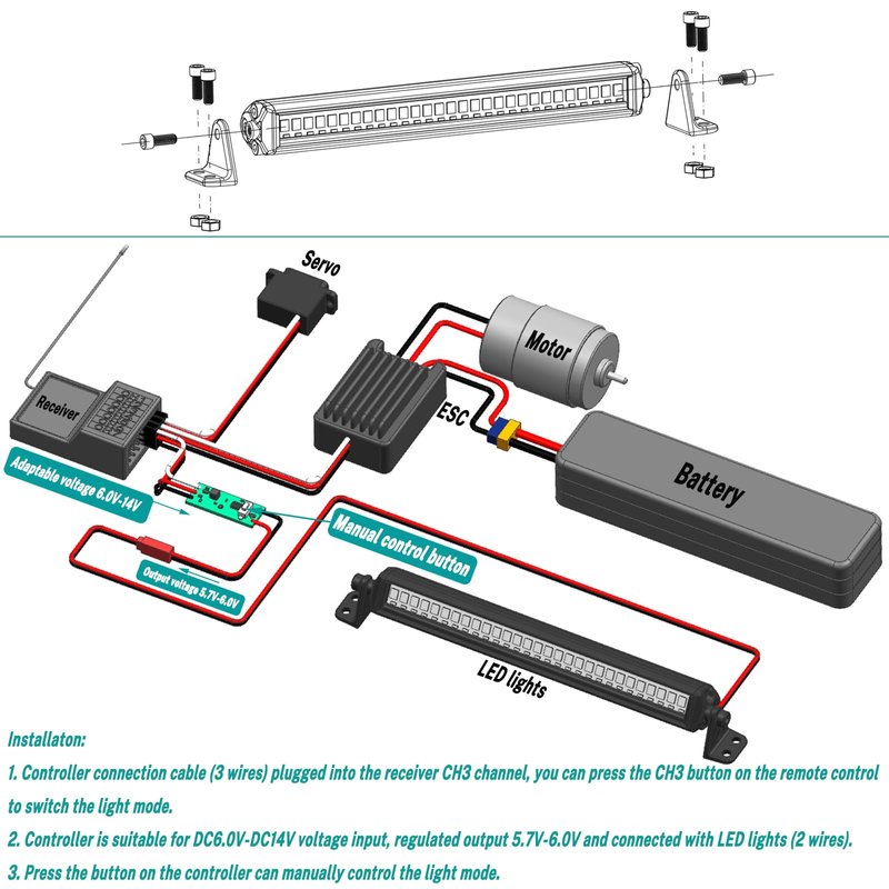 - 4.The LED strip is suitable for DC6.0V input, and the LED brightness and heat generation are optimal when the input voltage is 6.0V. The Red line is positive black line is negative, power should be provided by the receiver.The light becomes less bright when the voltage falls below 6V. Using a complementary buck-stabilized light control module, you can control the light remotely or manually. There are three lighting modes to choose from.