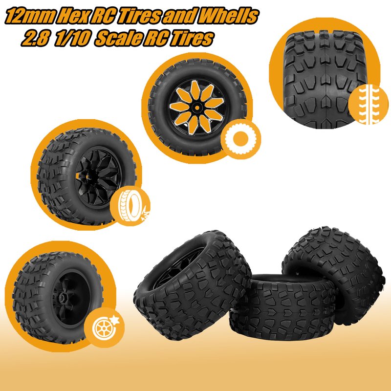 - Various Compatibility: Our 2.8 1/10 scale RC tires 12mm hex are universally compatible with a wide array of popular 1/10 scale RC racing cars with 12mm hex hubs, It's Compatible with Traxxas Rustler 2wd 4x4 VXL tires and Wheels, It's Compatible with Traxxas Stampede 2wd 4x4 VXL tires and wheels, It's Compatible with Traxxas Hoss 4X4 VXL Tires and Wheels, Compatible with Redcat Volcano Epx S30 Blackout XTE RC Truck tires and wheels, Compatible with 1/10 RIAARIO AMORIL tires and wheels.
