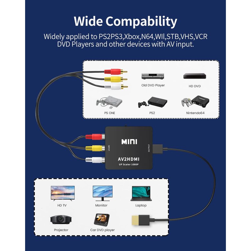 - Better Performance: AV to HDMI converter adapter offers HDMI output up to 720p/1080p 60Hz resolutions, provides advanced signal processing technology with great precision, colors, and details. Made of ABS material, it is wear-resistant and extremely stable. No driver need, user-friendly, easier, and quicker operation.