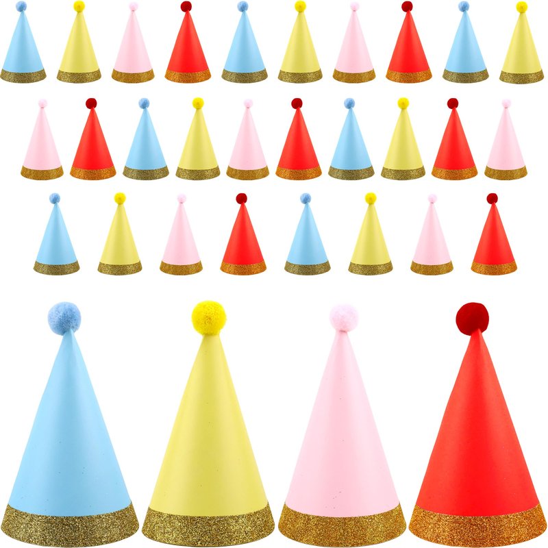- Package includes: you will receive 32 birthday party hats with pompoms, including 8 each in blue, yellow, red, and pink. The quantity is sufficient and the colors are diverse, which can easily meet various party needs. It is light and practical, making your party more colorful