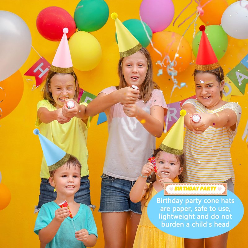 - Ingenious design: the eye-catching design of the birthday cone hats will make children who love sparkling elements love it. The party hats are decorated with golden glitter and soft pompoms, making them the focus of any celebration. With a sturdy elastic rope, they can be firmly fixed even in a lively party, allowing you to enjoy a happy time