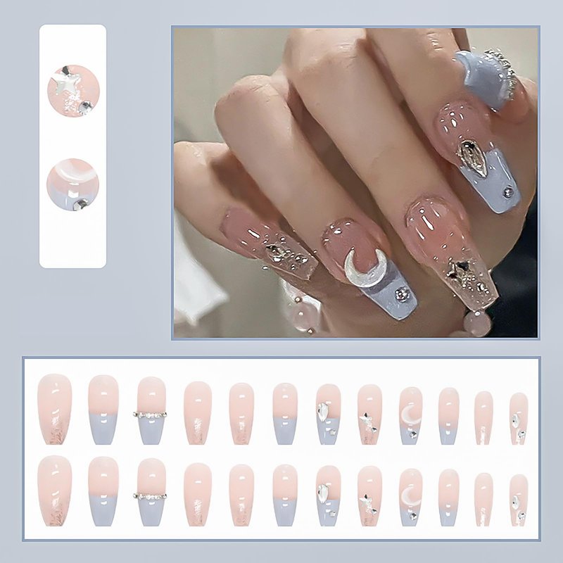 - Unique Design:Long coffin acrylic fake nail is designed by top manicurists,glue on nails features a stars moon diamond design that looks distinctive,this is a great choice to boost your mood.Suitable for many occasions such as your daily dress up,party,wedding,dating and so on.It will add charm and personality to you.