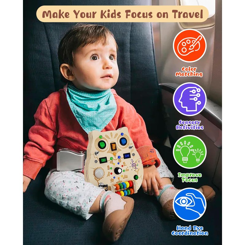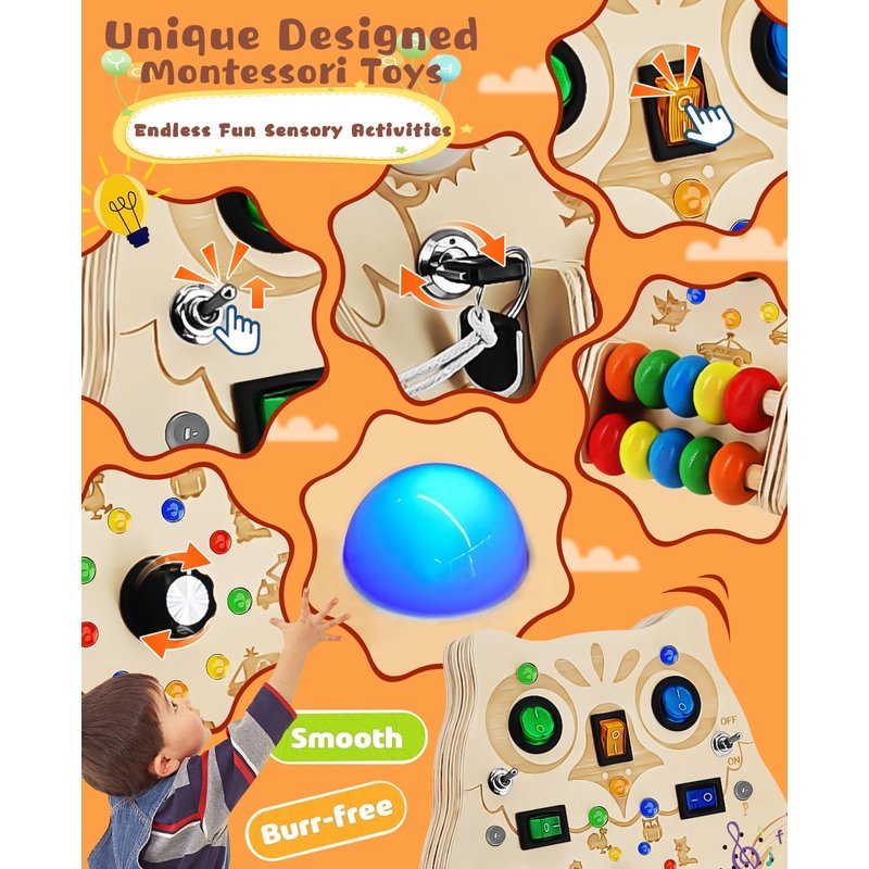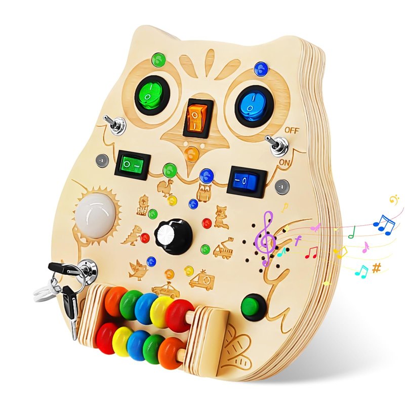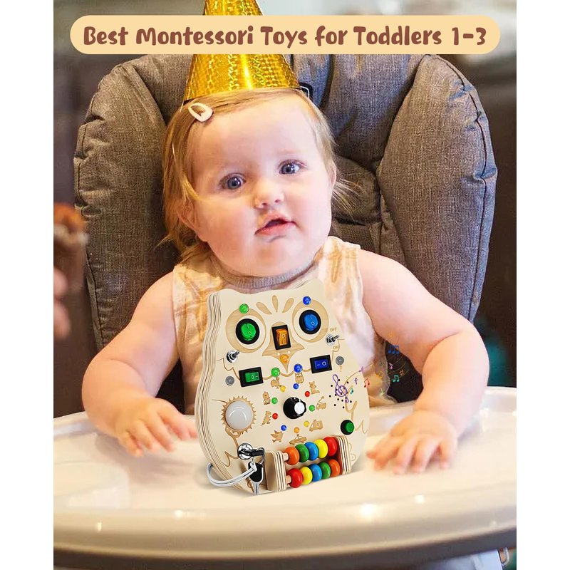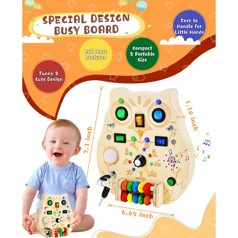 - Introducing our Unique Toddler Busy Board, designed with adorable owl elements that toddlers will love! This Wooden Busy Board Toy features switches and LED lights that will spark your child's curiosity and imagination. As a parent, we understand your concerns about hidden dangers, which is why this Toddler Busy Board is perfect for 1-4 year olds who love LED light switches and owl toys.