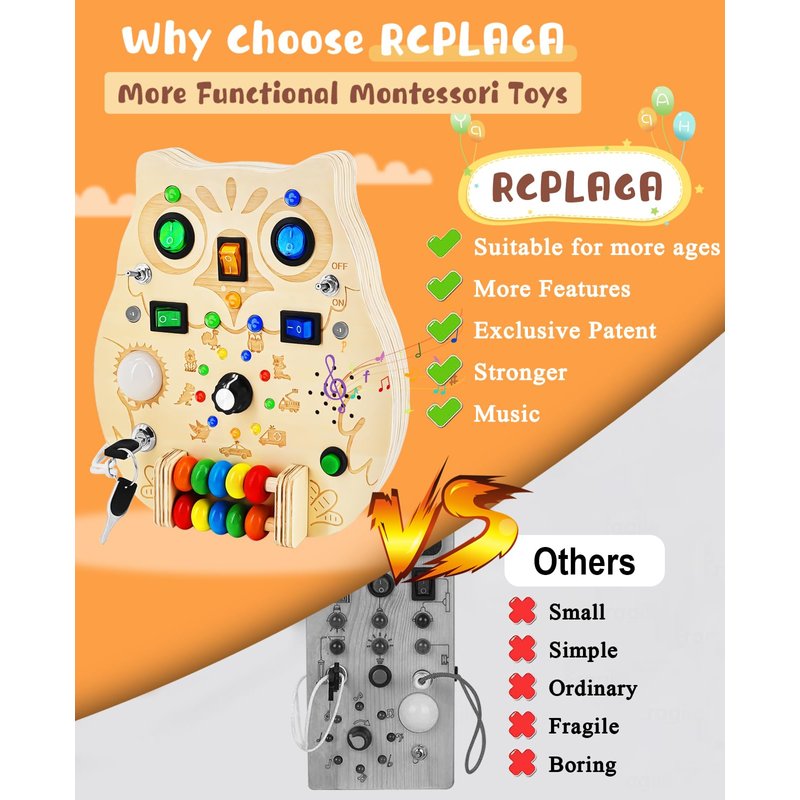 - The RCPLAGA Montessori Busy Board is a top-quality product that features 8 different switches, LED lights in various colors and styles, beads, 12 unique sounds, and a power area (batteries not included). The board contains a professional circuit board that's both durable and safe for children to use. The brightness of each LED is adjusted to be just right for the baby, not too bright, too dazzling or too dark to see clearly.