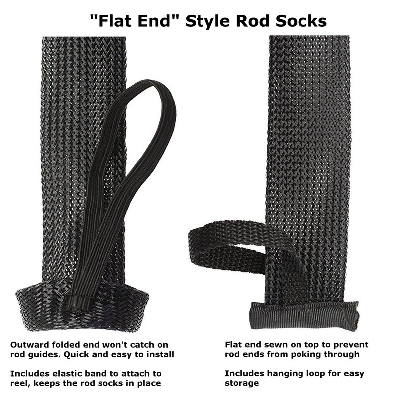 - POINTED or FLAT END style rod socks - Select your style when you pick your “SIZE” above; “POINTED END” Rod socks are pointed on the tip, great for storing in boats, rod lockers, storage tubes and any other tight areas “FLAT END” Rod socks are flat on the tip, the end is sewn on with a hanging loop, great for storing in garages and other storage areas