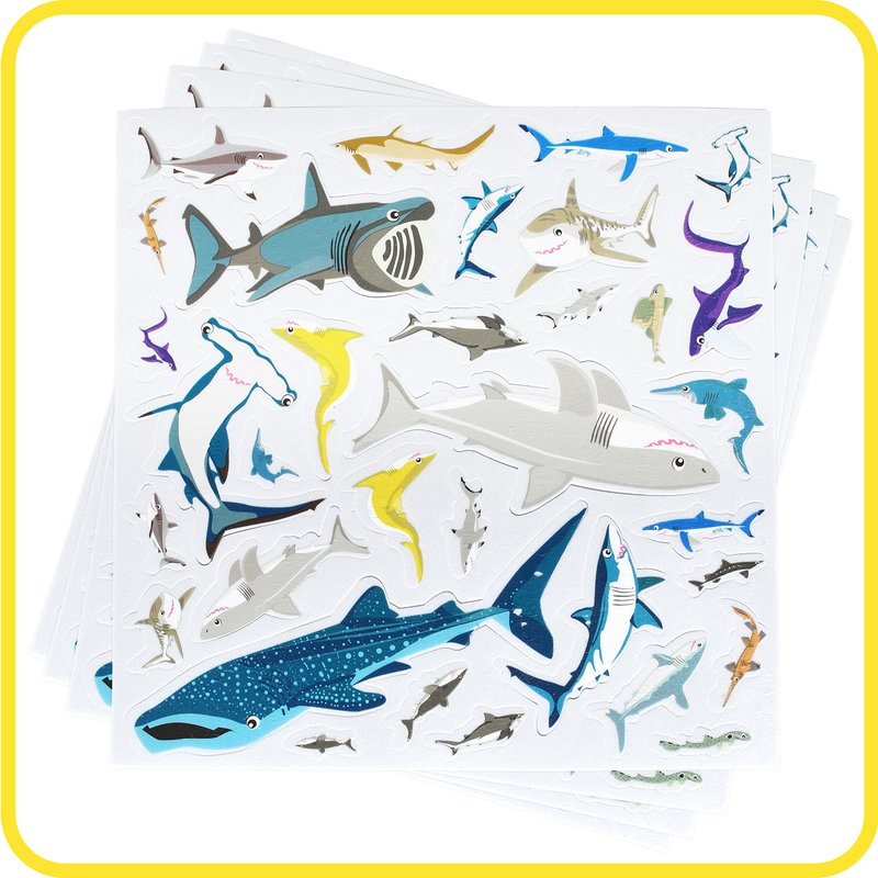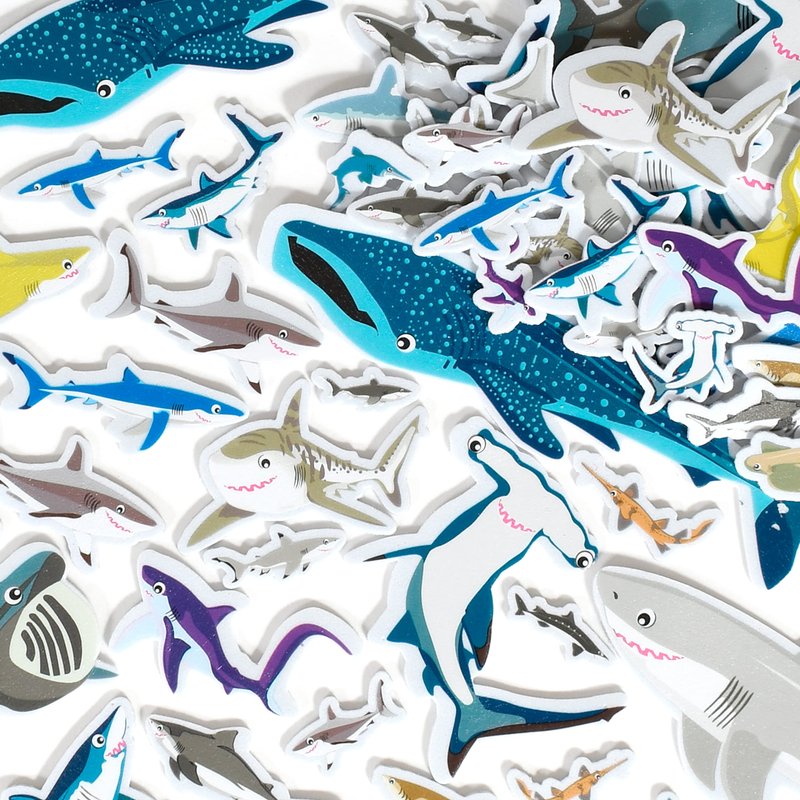 - 132 SHARK STICKERS -- This shark-themed sticker pack includes 4 foam sheets, each with 33 punch-out stickers in 20 different images. Decorate with great white sharks, tiger sharks and more!