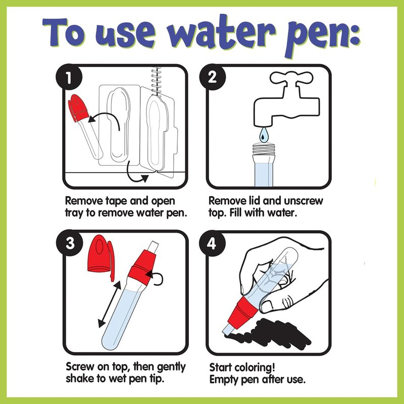 - PERFECT FOR TRAVEL -- Store the water pen inside of the book cover. And use the handle to take your creations on the go. Keep kids busy in cars or on planes with this mess-free activity.