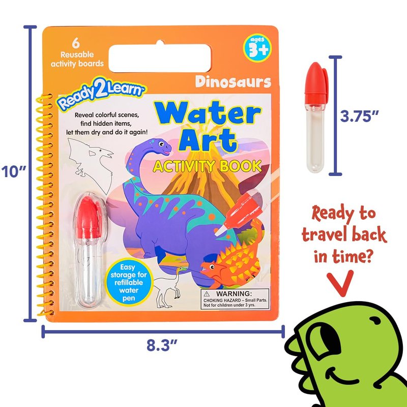- 6 REUSABLE ACTIVITIES -- This water art book features 6 different reusable activity boards. Use the mess-free, brush-tip water pen to reveal vibrant, dinosaur scenes.