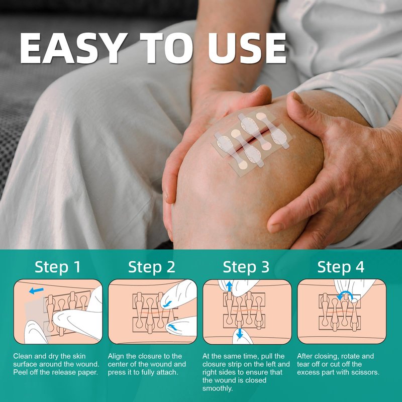- WOUND CLOSURE STRIPS: It is a non-invasive, painless, alternative to stitches. The laceration closure kit is more convenient than traditional stitches. The device can reduce tension, reduce hyperplasia and beautify wounds, and is ideal for sensitive skin and kids, ensuring a safer and faster recovery.