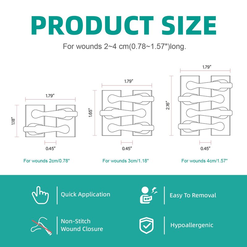 - APPLICABLE SIZES: 2 Strips - For wounds 2cm/0.78", 3 Strips - For wounds 3cm/1.18", 4 Strips - For wounds 4cm/1.57". After using the wound closure strips, apply this dressing to protect the wound. It is recommended to close the wound urgently after injury or to reduce wound tension after surgery to reduce scar formation. USE AFTER SURGERY MUST FOLLOW THE DOCTOR'S ADVICE.