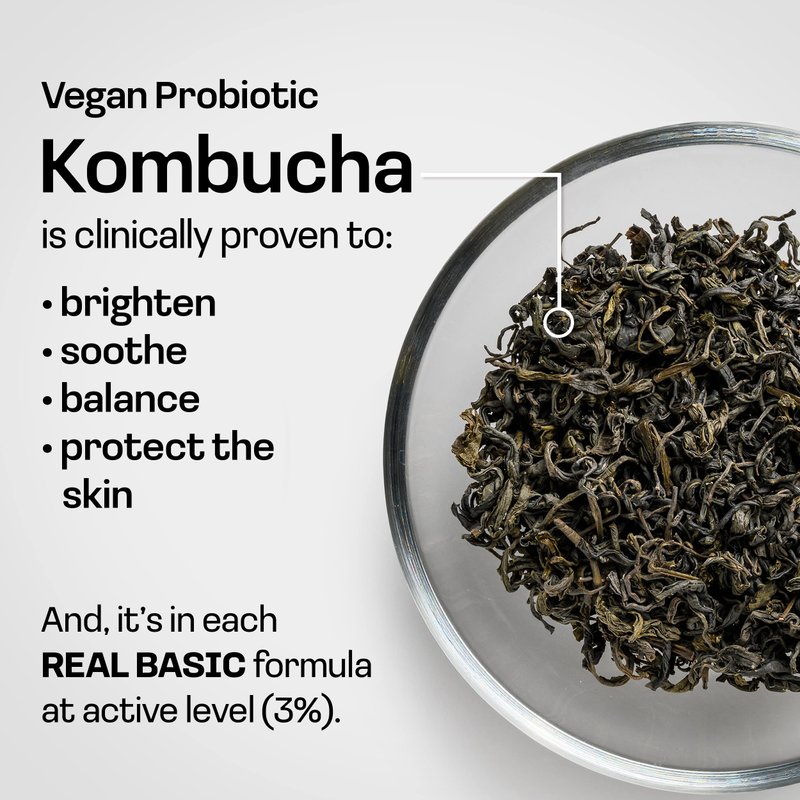 - Real Basic Serum for Brighter + Even Skin: A universal serum for the appearance of brighter, even looking skin. This intensive serum with 8% Ascorbic Acid, optimized with Ferulic Acid, and infused with Kombucha will help rejuvenate and energize dull skin, and will work hard to noticeably brighten and even out your skin’s appearance.