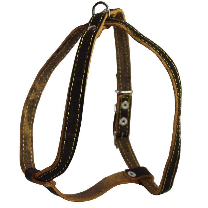 Made of 1/2" wide genuine leather. Strong and comfortable. Designed to equally distribute tension. Trimmed with thick contrast color waxed thread. Best choice for daily walks. This size is recommended for Medium breeds, sized to fit 15-19 inches chest circumference.