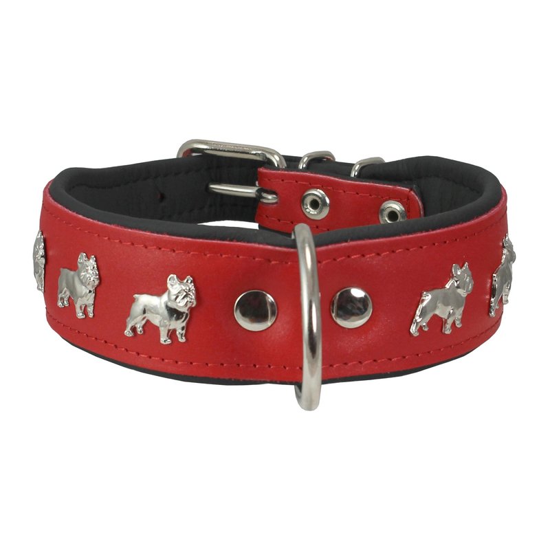 Superior craftsmanship. High quality 100% genuine leather top surface. Strong, durable, pliable, and very comfortable wide dog collar for every day use. Very soft leather oversize lining provide soft cushioning feel. Bright colors give a unique, smooth and elegant look. Enhanced with nickel plated bulldog figures. Features solid nickel plated hardware. Ideal collar for every day use. Please measure dogs neck to ensure you order the correct size.
