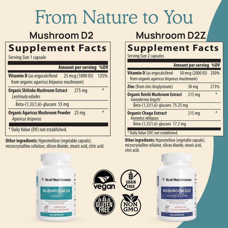 Real Mushrooms was created to emphasize the fact that our products are solely made from mushrooms. We are committed to delivering the best possible mushroom extracts in their quality form without carriers, grain fillers, or additives, unlike most vitamin d vegan, vitamin d supplements, best vitamin d supplements, vitamin d supplement, vitamin d2, vitamin d, organic vitamin d, vitamin d 2000, vitamin d chewable adults, vitamin d 2000 iu, vitamin d 1000 iu, vitamin d organic, vitamins supplements, vegan vitamins, vitamin d 1000, vegan vitamin organic vitamin, organic vitamins, or other vegan supplement in the market. We pride ourselves on our expertise in mushroom growing, with over 40 years of experience. This knowledge allows us to produce high-quality organic mushroom supplements that can support your overall health and well-being. We are dedicated to bringing the benefits of mushrooms to everyone, and we believe in the power of natural ingredients to nourish the body. Our commitment to quality, purity, and sustainability is reflected in every product we make. We hope you enjoy Real Mushrooms D2 and D2Z as much as we do.