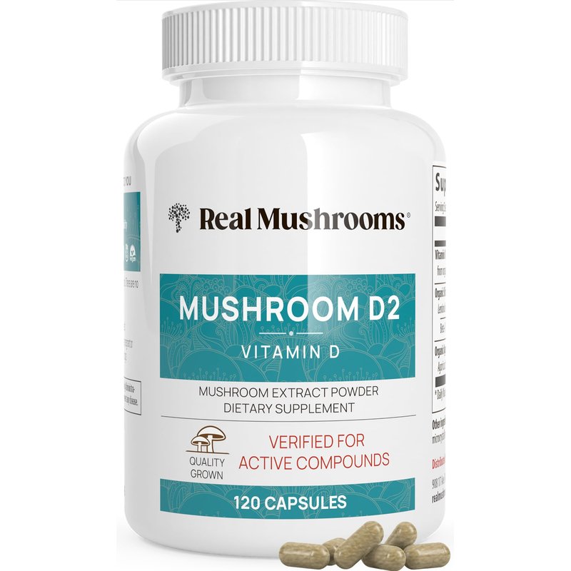 Real Mushrooms Vitamin D2 (120 ct) Vegan Vitamin D Supplements - Organic Vitamin D Vegan Supplement 1000 IU Shiitake & Agaricus Mushroom Complex - Vegan Vitamins for Bone & Muscle Health, Energy, Mood