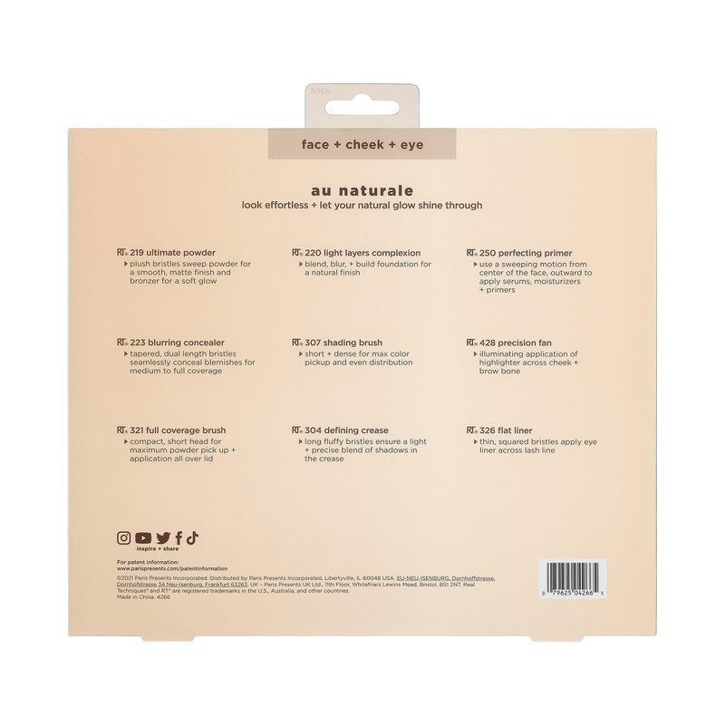 - The Real Techniques Au Naturale Makeup Brush Kit includes (1) RT 219 ultimate powder brush, (1) RT 220 light layers complexion brush, (1) RT 250 perfecting prime brush, (1) RT 223 blurring concealer brush, (1) RT 307 shading brush, (1) RT 428 precision fan brush, (1) RT 321 full coverage brush, (1) RT 304 defining crease brush, and (1) RT 326 flat liner brush