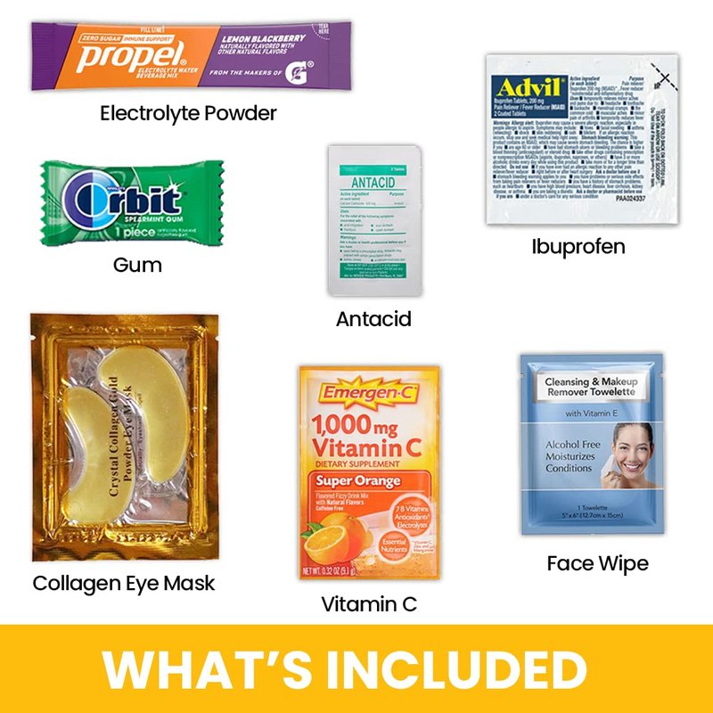 - π WHATβS INCLUDED: Our goal was to cover the main aspects of party recovery - fast acting body remedies, energy, and feeling/looking fresh! Each hangover kit includes: 1x Electrolyte Powder, 1x mint gum packetor ginger chew, 1x Collagen Eye Mask, 1x 1000mg packet of Vitamin C, 1x Makeup Remover, 1x Ibuprofen, 1x antacid, AND the perfect bag prefilled and ready to go.