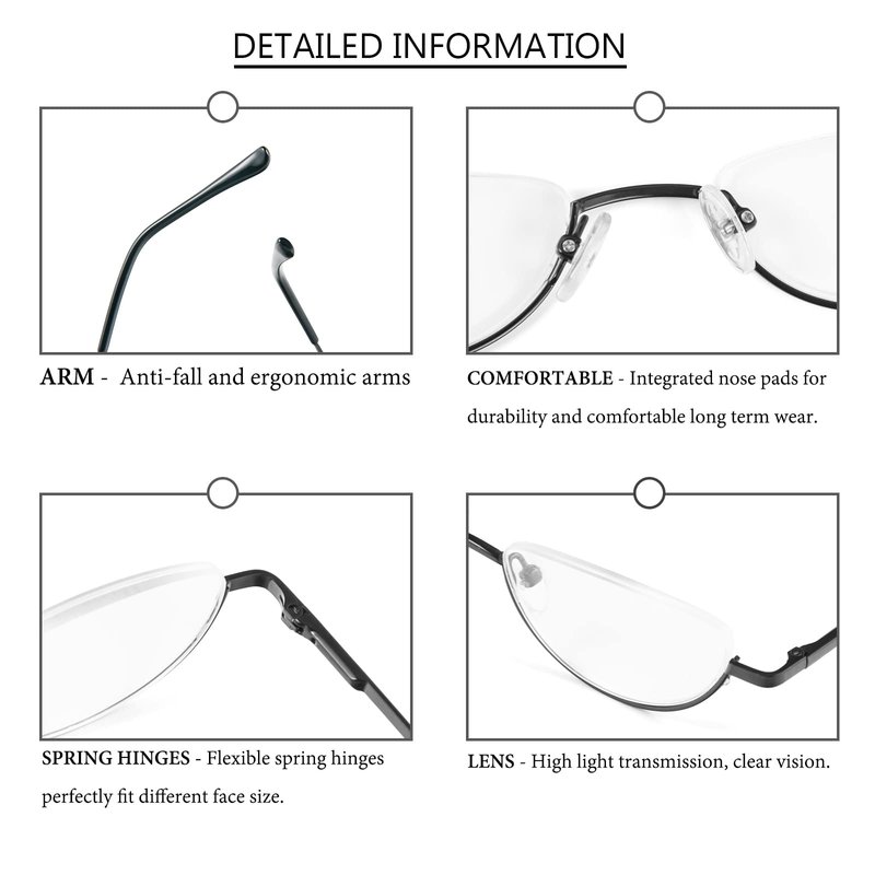REAVEE Men Women’s Half Frame Reading Glasses are perfect for those that like to keep their reading glasses on at all times. Simply look down to read your favorite novel, and look up and over your reading glasses to observe your surroundings as you normally would.
