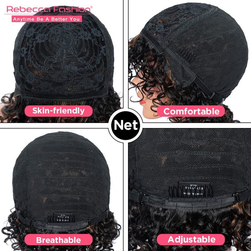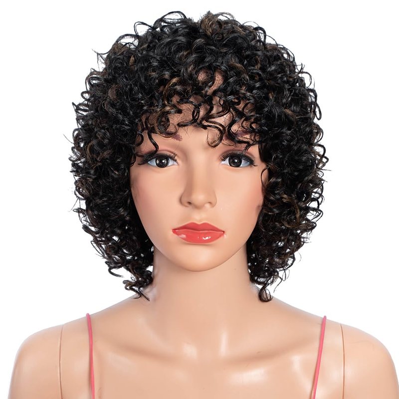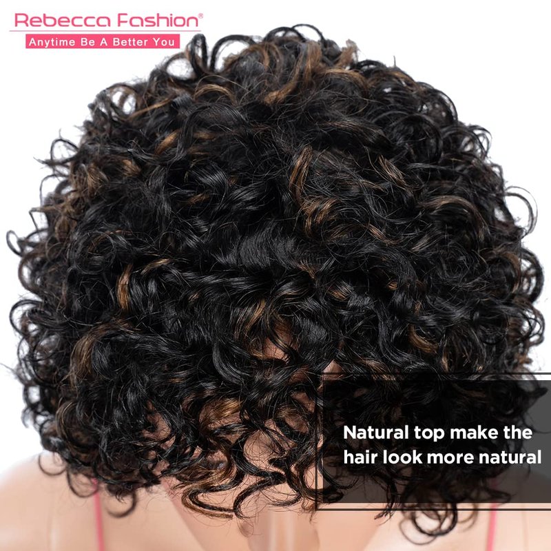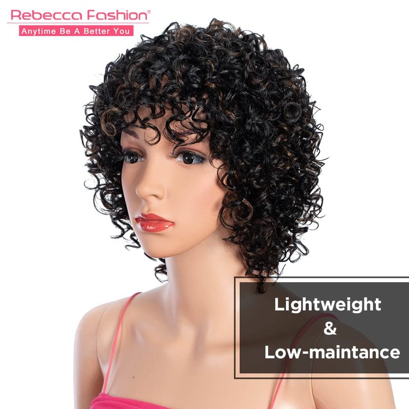 Rebecca Fashion 8" Highlight Brown Wigs for Black Women Human Hair, Short Curly Wigs with Bangs, 10A Brazilian Virgin 150% Density, Wear and Go Glueless Wigs (Black Mixed Brown)