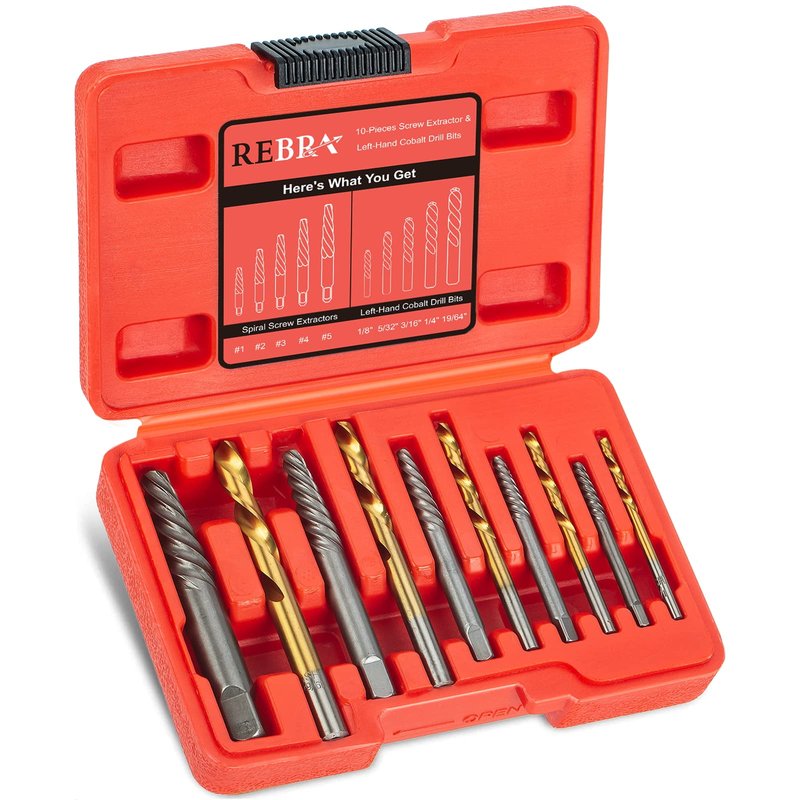 REBRA Screw Extractor and Left-Hand Drill Bit Set, Easy Out Broken Bolt Remover Reverse Cobalt HSS Steel Drill Kit, Ez Out Stripped, Rounded-Off, Damaged Bolts, Screws&Studs Removal Tool 10-Pieces