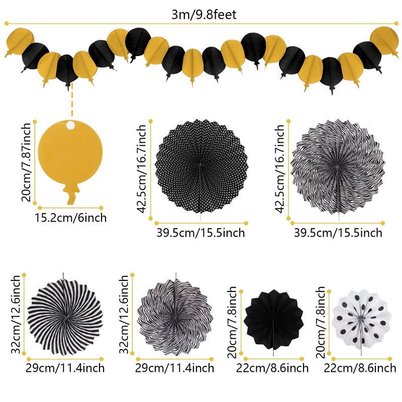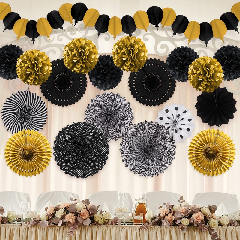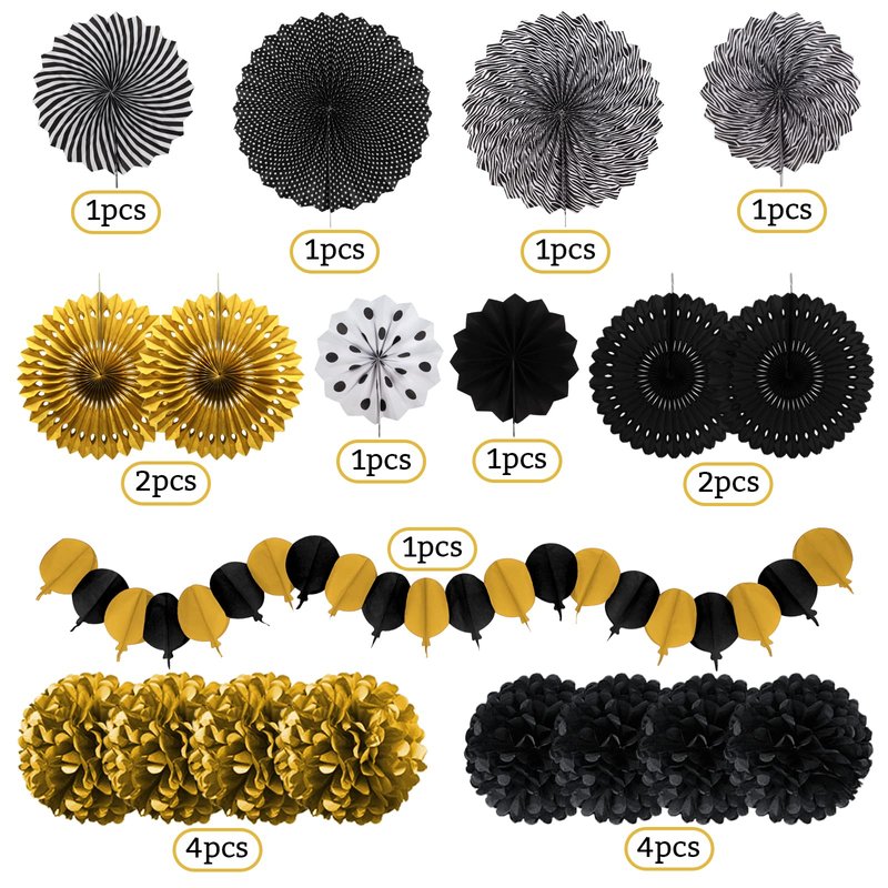 • 【Black Gold Party】6 x paper fans, 8 x paper pompoms, 4 x paper hollow fans, 1 x paper hot air balloon garland( Color: Black and Gold )