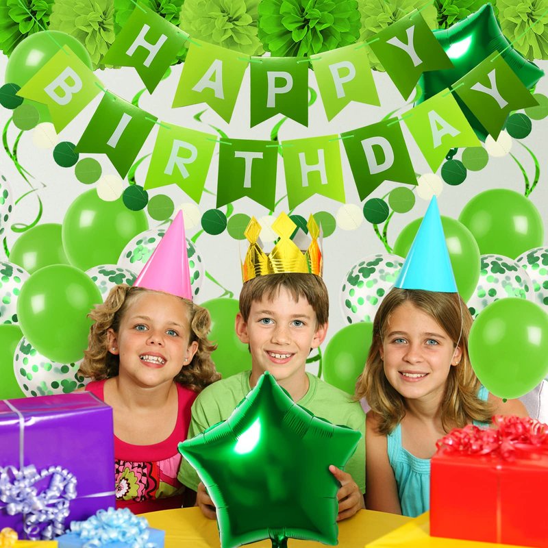 - 【Green 】1 x happy birthday banner, 4 x green paper pompoms, 4 x light green paper pompoms, 5 x green hanging swirls, 10 x green balloons, 10 x green confetti balloons, 2 x green star foil balloons, 1 x star paper garland.