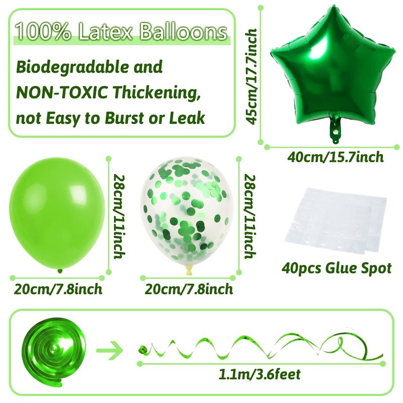 Quantity: 10 x Green balloons, 10 x Green confetti balloons